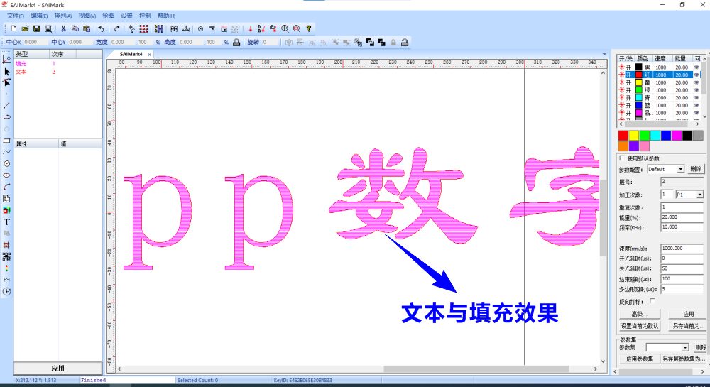 选择填充方式、确定线条间距、线条角度、线条打标图层,再点击“确定”